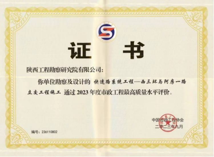 該獎項由中國市政協(xié)會組織實施,代表市政工程行業(yè)同時期國內(nèi)先進(jìn)水平,獲獎要求高,評選程序嚴(yán)格,是我國市政行業(yè)在工程質(zhì)量方面的最高榮譽(yù)。此前由我公司負(fù)責(zé)勘察的西三環(huán)與阿房一路立交工程施工項目獲2023年度市政工程最高質(zhì)量水平評價,今年西銅高速城市段快速路工程(鳳城十二路-秦漢大道立交南)市政工程又獲2024年度市政工程最高質(zhì)量水平評價。連續(xù)兩年榮獲該項“國字”榮譽(yù),充分展示出公司近年來在勘察領(lǐng)域扎實的專業(yè)功底及人才培養(yǎng)方面取得的突出成效。